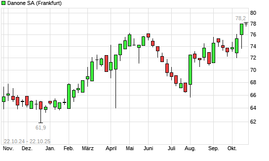 Mit dem Anstieg auf 78,00 EUR hat die Danone-Aktie (ISIN FR0000120644) am 21.10.2025 ein neues 5-Jahres-Hoch erreicht und damit den Kurs vom 17.10.2025 eingestellt.