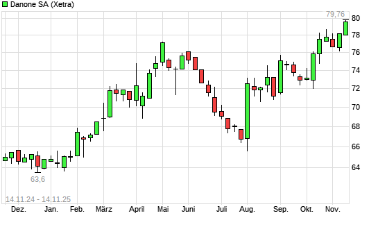 Mit dem Anstieg auf 79,70 EUR hat die Danone-Aktie (ISIN FR0000120644) am 13.11.2025 ein neues 5-Jahres-Hoch erreicht und damit den Kurs vom 12.11.2025 eingestellt.