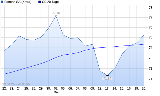 Mit dem Anstieg auf 74,58 EUR hat die Danone-Aktie am 19.05.2025 die 20-Tage-Linie nach oben gekreuzt.