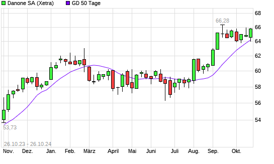 Mit dem Anstieg auf 65,76 EUR hat die Danone-Aktie am 25.10.2024 die 50-Tage-Linie nach oben gekreuzt.
