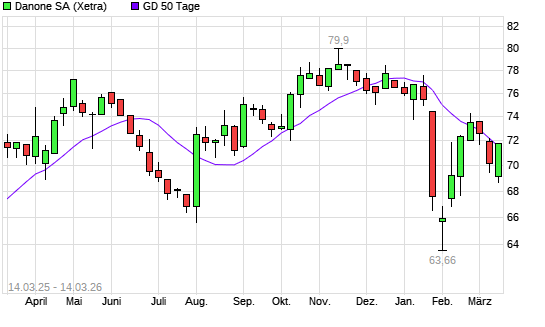 Mit dem Anstieg auf 71,84 EUR hat die Danone-Aktie am 13.03.2026 die 50-Tage-Linie nach oben gekreuzt.