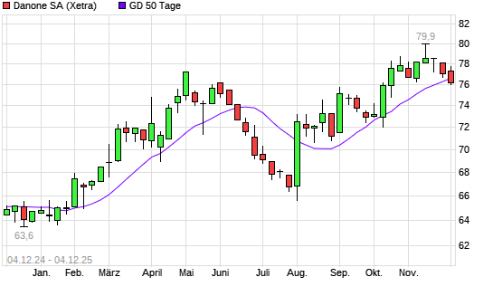 Mit dem Rücksetzer auf 76,40 EUR hat die Danone-Aktie am 03.12.2025 die 50-Tage-Linie nach unten gekreuzt.