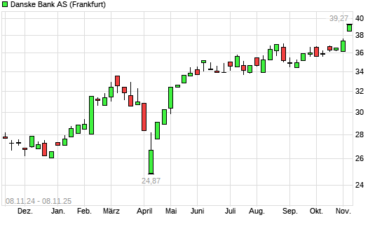 Mit dem Anstieg auf 39,27 EUR hat die Danske Bank-Aktie (ISIN DK0010274414) am 07.11.2025 ein neues All-Time-High erreicht und damit den Kurs vom 03.11.2025 eingestellt.