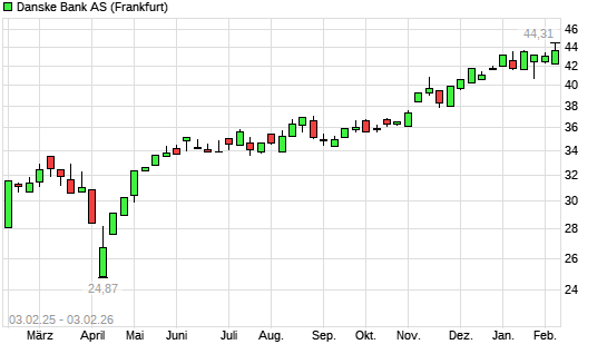 Mit dem Anstieg auf 44,31 EUR hat die Danske Bank-Aktie (ISIN DK0010274414) am 02.02.2026 ein neues All-Time-High erreicht und damit den Kurs vom 15.01.2026 eingestellt.