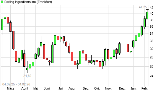 Mit dem Anstieg auf 40,35 EUR hat die Darling Ingredients-Aktie (ISIN US2372661015) am 03.02.2026 ein neues 12-Monats-Hoch erreicht und damit den Kurs vom 02.02.2026 eingestellt.