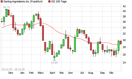 Mit dem Rücksetzer auf 28,83 EUR hat die Darling Ingredients-Aktie am 28.10.2025 die 100-Tage-Linie nach unten gekreuzt.