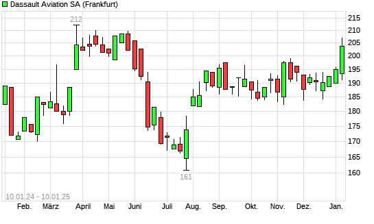 Mit dem Anstieg auf 206,60 EUR hat die Dassault Aviation-Aktie (ISIN FR0014004L86) am 09.01.2025 ein neues 6-Monats-Hoch erreicht und damit den Kurs vom 08.01.2025 eingestellt.