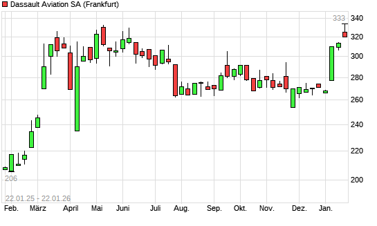 Mit dem Anstieg auf 333,00 EUR hat die Dassault Aviation-Aktie (ISIN FR0014004L86) am 21.01.2026 ein neues All-Time-High erreicht und damit den Kurs vom 05.05.2025 eingestellt.