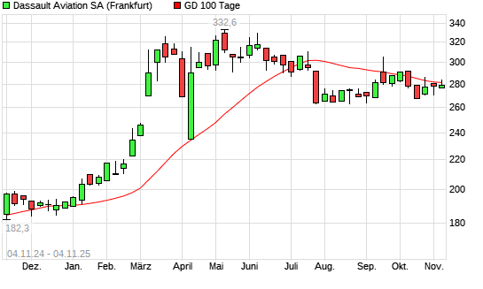 Mit dem Anstieg auf 283,60 EUR hat die Dassault Aviation-Aktie am 03.11.2025 die 100-Tage-Linie nach oben gekreuzt.
