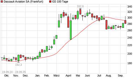 Mit dem Rücksetzer auf 290,20 EUR hat die Dassault Aviation-Aktie am 18.09.2025 die 100-Tage-Linie nach unten gekreuzt.