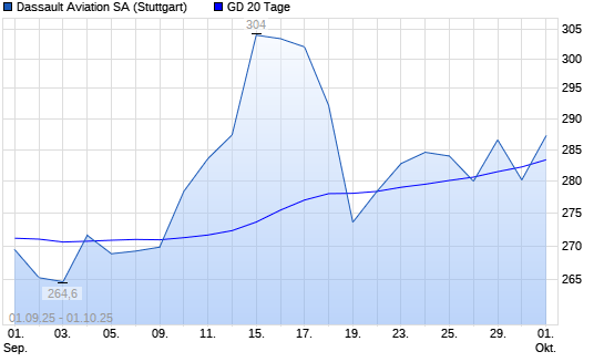 Mit dem Rücksetzer auf 282,00 EUR hat die Dassault Aviation-Aktie am 30.09.2025 die 20-Tage-Linie nach unten gekreuzt.