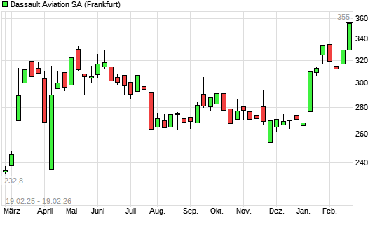 Mit dem Anstieg auf 350,00 EUR hat die Dassault Aviation-Aktie (ISIN FR0014004L86) am 18.02.2026 ein neues All-Time-High erreicht und damit den Kurs vom 16.02.2026 eingestellt.Die ...weiterlesen