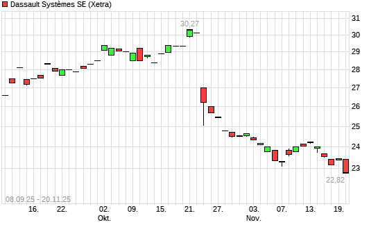 Mit dem Rücksetzer auf 22,88 EUR hat die Dassault Systèmes-Aktie (ISIN FR0014003TT8) am 21.11.2025 ein neues 5-Jahres-Tief erreicht und damit den Kurs vom 06.11.2025 eingestellt.