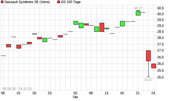 Mit dem Rücksetzer auf 26,02 EUR hat die Dassault Systèmes-Aktie am 23.10.2025 die 100-Tage-Linie nach unten gekreuzt.
