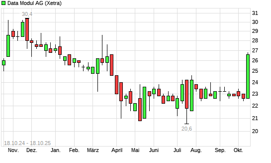 Mit dem Anstieg auf 26,00 EUR hat die Data Modul-Aktie (ISIN DE0005498901) am 17.10.2025 ein neues 6-Monats-Hoch erreicht und damit den Kurs vom 16.10.2025 eingestellt.