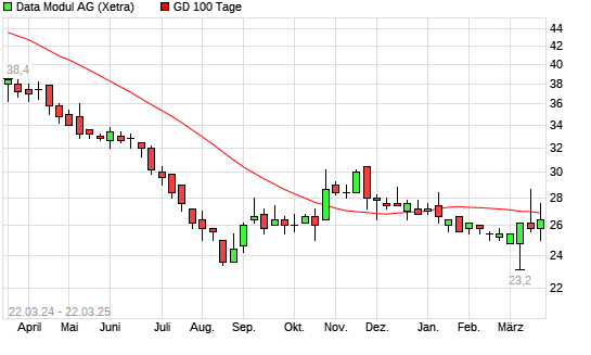 Mit dem Rücksetzer auf 26,00 EUR hat die Data Modul-Aktie am 21.03.2025 die 100-Tage-Linie nach unten gekreuzt.