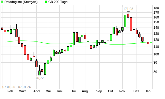 Mit dem Anstieg auf 117,22 EUR hat die Datadog-Aktie am 06.01.2026 die 200-Tage-Linie nach oben gekreuzt.