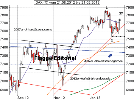Rosenheim (DAX-Premium-Trader) - Das deutsche Leitbarometer sackte nach Überwinden des GD20 am gestrigen Mittwoch erneut unter 7700 Punkte ab. Der Befreiungsschlag von rund 150 Punkten vom Dienstag wurde somit direkt wieder vom Tisch gewischt. Summa summarum muss der Index nun ein Minus von 2% im Sieben- Tages-Vergleich hinnehmen. Auch das Trendbarometer fiel leicht von 81% auf 79%.