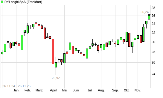 Mit dem Anstieg auf 36,08 EUR hat die De'Longhi-Aktie (ISIN IT0003115950) am 25.11.2025 ein neues 3-Jahres-Hoch erreicht und damit den Kurs vom 24.11.2025 eingestellt.