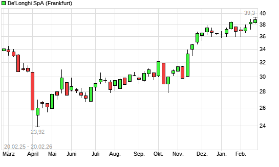 Mit dem Anstieg auf 38,96 EUR hat die De'Longhi-Aktie (ISIN IT0003115950) am 19.02.2026 ein neues 3-Jahres-Hoch erreicht und damit den Kurs vom 18.02.2026 eingestellt.