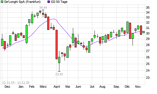 Mit dem Anstieg auf 30,38 EUR hat die De'Longhi-Aktie am 10.11.2025 die 50-Tage-Linie nach oben gekreuzt.