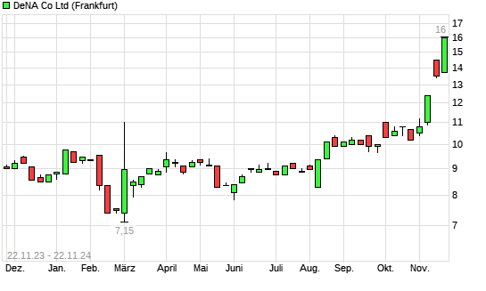 Mit dem Anstieg auf 15,10 EUR hat die DeNA-Aktie (ISIN JP3548610009) am 21.11.2024 ein neues 3-Jahres-Hoch erreicht und damit den Kurs vom 20.11.2024 eingestellt.