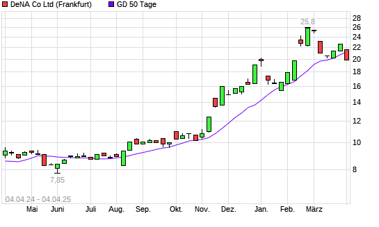 Mit dem Rücksetzer auf 21,00 EUR hat die DeNA-Aktie am 03.04.2025 die 50-Tage-Linie nach unten gekreuzt.