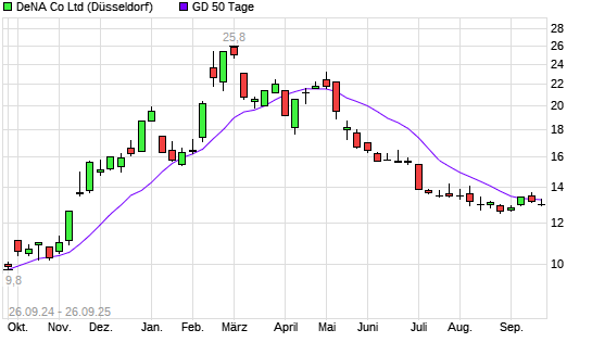 Mit dem Rücksetzer auf 13,30 EUR hat die DeNA-Aktie am 25.09.2025 die 50-Tage-Linie nach unten gekreuzt.