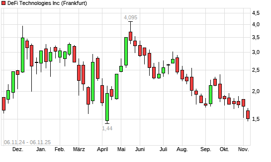 Mit dem Rücksetzer auf 1,49 EUR hat die Defi Technologies-Aktie (ISIN CA2449161025) am 05.11.2025 ein neues 12-Monats-Tief erreicht und damit den Kurs vom 04.11.2025 eingestellt.