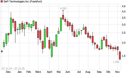 Mit dem Rücksetzer auf 1,41 EUR hat die Defi Technologies-Aktie (ISIN CA2449161025) am 06.11.2025 ein neues 12-Monats-Tief erreicht und damit den Kurs vom 05.11.2025 eingestellt.