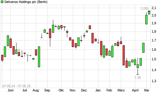 Mit dem Anstieg auf 2,00 EUR hat die Deliveroo-Aktie (ISIN GB00BNC5T391) am 06.05.2025 ein neues 3-Jahres-Hoch erreicht und damit den Kurs vom 05.05.2025 eingestellt.