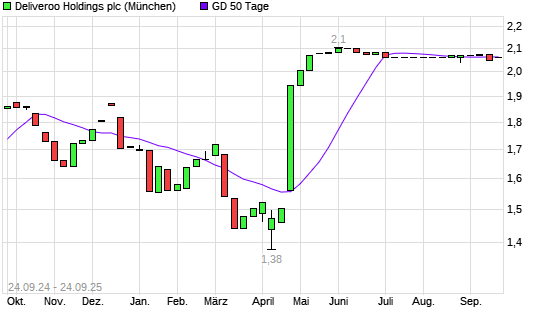 Mit dem Rücksetzer auf 2,02 EUR hat die Deliveroo-Aktie am 23.09.2025 die 50-Tage-Linie nach unten gekreuzt.