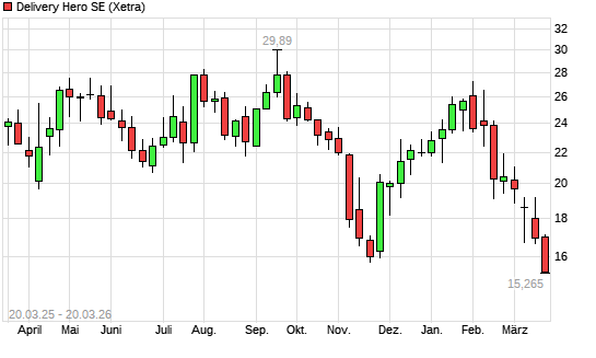 Mit dem Rücksetzer auf 15,41 EUR hat die Delivery Hero-Aktie (ISIN DE000A2E4K43) am 19.03.2026 ein neues All-Time-Low erreicht und damit den Kurs vom 21.11.2025 eingestellt.