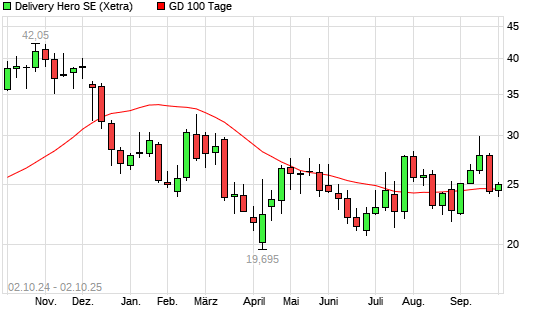 Mit dem Anstieg auf 25,15 EUR hat die Delivery Hero-Aktie am 01.10.2025 die 100-Tage-Linie nach oben gekreuzt.