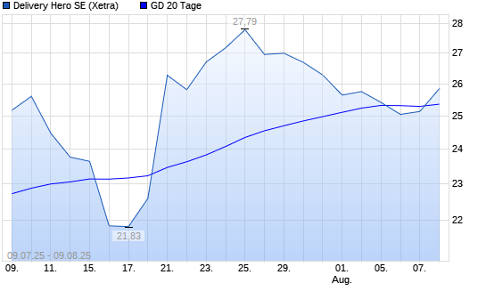 Mit dem Rücksetzer auf 25,02 EUR hat die Delivery Hero-Aktie am 08.08.2025 die 20-Tage-Linie nach unten gekreuzt.
