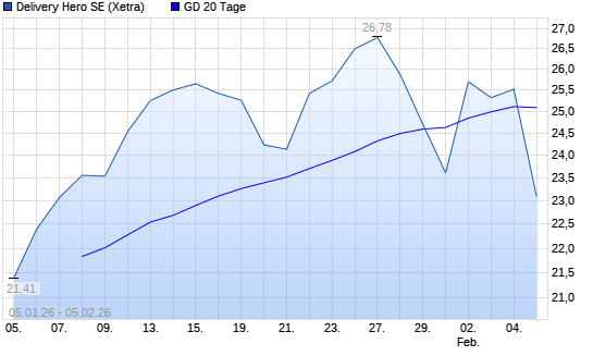 Mit dem Rücksetzer auf 25,00 EUR hat die Delivery Hero-Aktie am 04.02.2026 die 20-Tage-Linie nach unten gekreuzt.