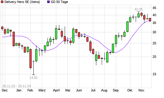 Mit dem Rücksetzer auf 35,83 EUR hat die Delivery Hero-Aktie am 18.11.2024 die 50-Tage-Linie nach unten gekreuzt.