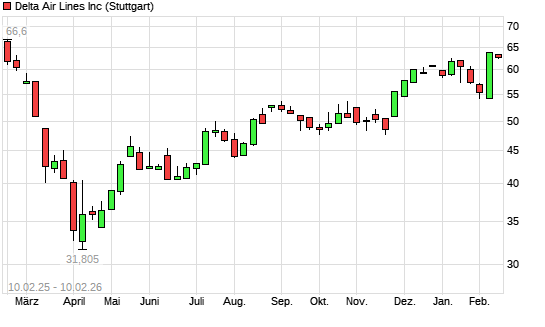 Mit dem Anstieg auf 63,36 EUR hat die Delta Air Lines-Aktie (ISIN US2473617023) am 09.02.2026 ein neues 6-Monats-Hoch erreicht und damit den Kurs vom 07.01.2026 eingestellt.