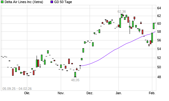 Mit dem Anstieg auf 60,19 EUR hat die Delta Air Lines-Aktie am 03.02.2026 die 50-Tage-Linie nach oben gekreuzt.