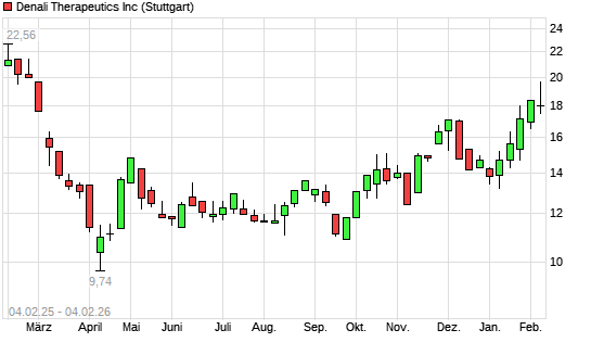 Mit dem Anstieg auf 19,54 EUR hat die Denali Therapeutics-Aktie (ISIN US24823R1059) am 03.02.2026 ein neues 6-Monats-Hoch erreicht und damit den Kurs vom 02.02.2026 eingestellt.