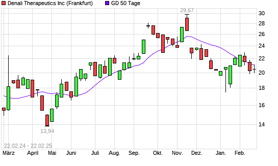 Mit dem Rücksetzer auf 20,78 EUR hat die Denali Therapeutics-Aktie am 21.02.2025 die 50-Tage-Linie nach unten gekreuzt.