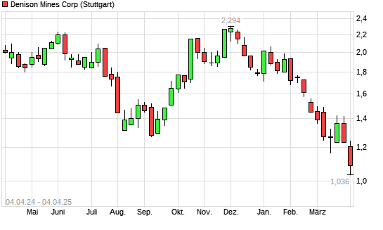 Mit dem Rücksetzer auf 1,10 EUR hat die Denison Mines-Aktie (ISIN CA2483561072) am 03.04.2025 ein neues 12-Monats-Tief erreicht und damit den Kurs vom 02.04.2025 eingestellt.