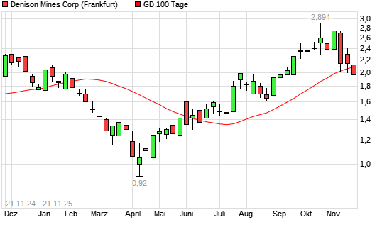 Mit dem Rücksetzer auf 2,00 EUR hat die Denison Mines-Aktie am 20.11.2025 die 100-Tage-Linie nach unten gekreuzt.