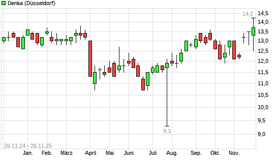 Mit dem Anstieg auf 13,70 EUR hat die Denka-Aktie (ISIN JP3549600009) am 25.11.2025 ein neues 6-Monats-Hoch erreicht und damit den Kurs vom 08.09.2025 eingestellt.