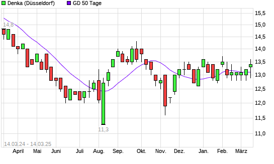 Mit dem Anstieg auf 13,70 EUR hat die Denka-Aktie am 13.03.2025 die 50-Tage-Linie nach oben gekreuzt.
