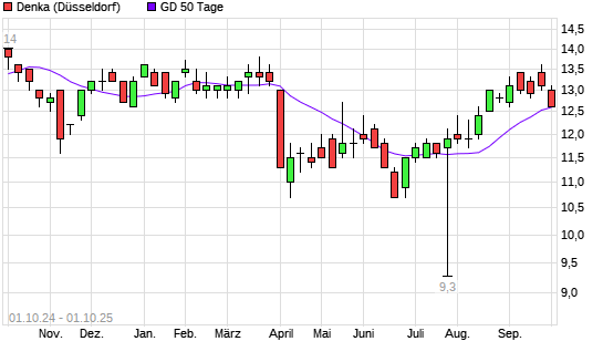 Mit dem Rücksetzer auf 12,70 EUR hat die Denka-Aktie am 30.09.2025 die 50-Tage-Linie nach unten gekreuzt.