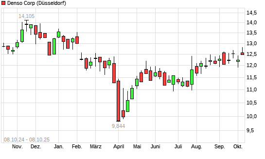 Mit dem Anstieg auf 12,79 EUR hat die Denso-Aktie (ISIN JP3551500006) am 07.10.2025 ein neues 6-Monats-Hoch erreicht und damit den Kurs vom 25.08.2025 eingestellt.