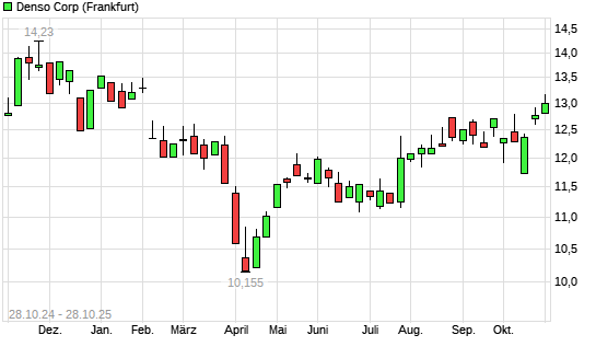 Mit dem Anstieg auf 13,17 EUR hat die Denso-Aktie (ISIN JP3551500006) am 27.10.2025 ein neues 6-Monats-Hoch erreicht und damit den Kurs vom 22.10.2025 eingestellt.