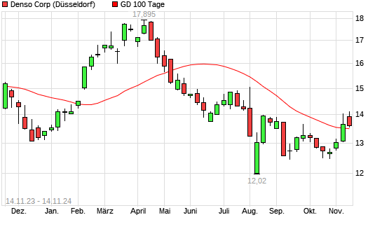 Mit dem Rücksetzer auf 13,48 EUR hat die Denso-Aktie am 13.11.2024 die 100-Tage-Linie nach unten gekreuzt.