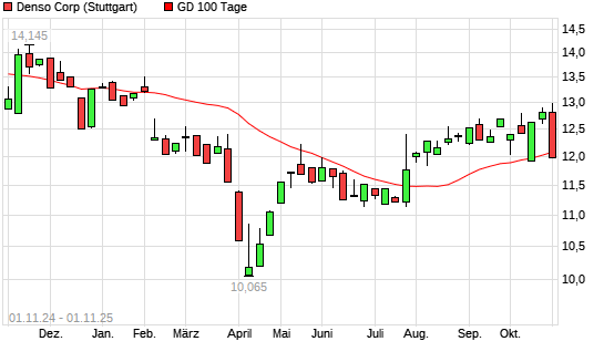 Mit dem Rücksetzer auf 11,94 EUR hat die Denso-Aktie am 31.10.2025 die 100-Tage-Linie nach unten gekreuzt.